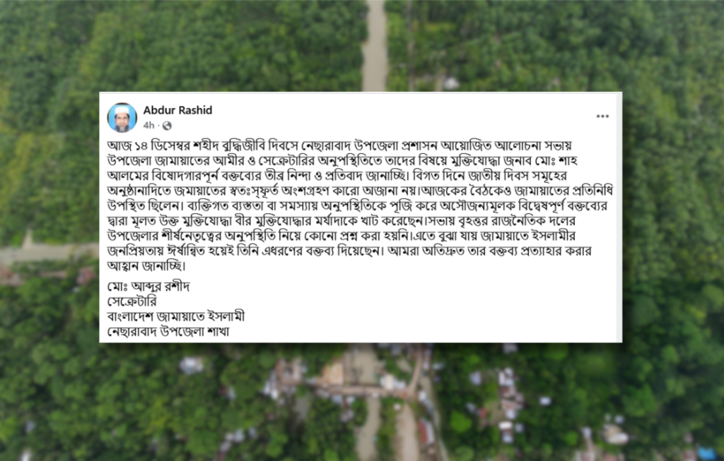 ফেসবুক পোস্টে তিনি উল্লেখ করেন, শহীদ বুদ্ধিজীবী দিবসের আলোচনা সভায় উপজেলা জামায়াতের আমীর ও সেক্রেটারির অনুপস্থিতিকে কেন্দ্র করে জামায়াত সম্পর্কে যে বক্তব্য দেওয়া হয়েছে, তা অসৌজন্যমূলক ও বিদ্বেষপূর্ণ। তিনি দাবি করেন, অতীতের সব জাতীয় দিবসের কর্মসূচিতে জামায়াতে ইসলামী স্বতঃস্ফূর্তভাবে অংশগ্রহণ করে এসেছে, যা কারও অজানা নয়। আজকের সভাতেও জামায়াতের প্রতিনিধি উপস্থিত ছিলেন বলেও তিনি উল্লেখ করেন।